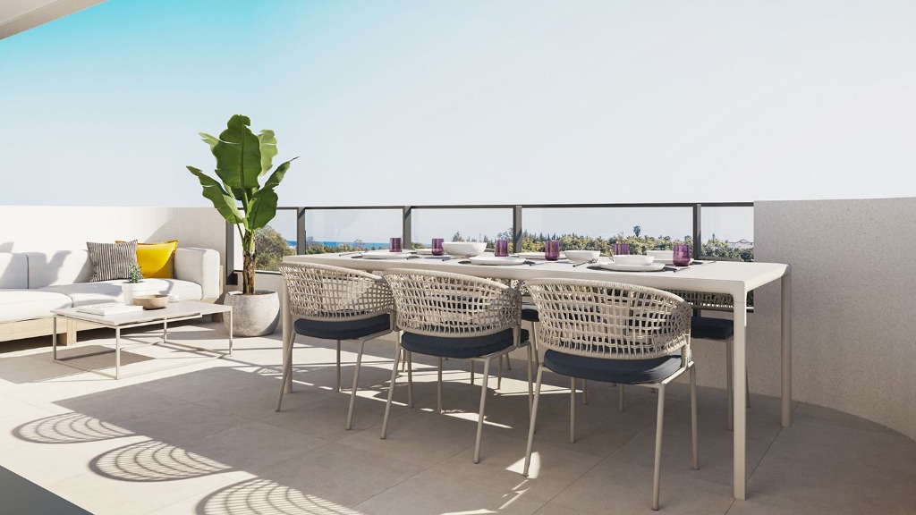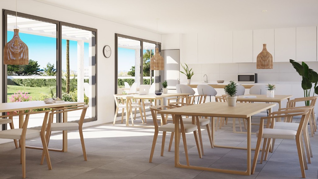 Gemeenschappelijke ruimtes in dit nieuwe project zijn onder andere een co-working ruimte, een fitnessruimte, een speeltuin voor kinderen en weelderige tuinen. Het grote gemeenschappelijke zwembad is het hele jaar door beschikbaar met chloorzout, zodat je optimaal kunt profiteren van het klimaat aan de Costa del Sol.