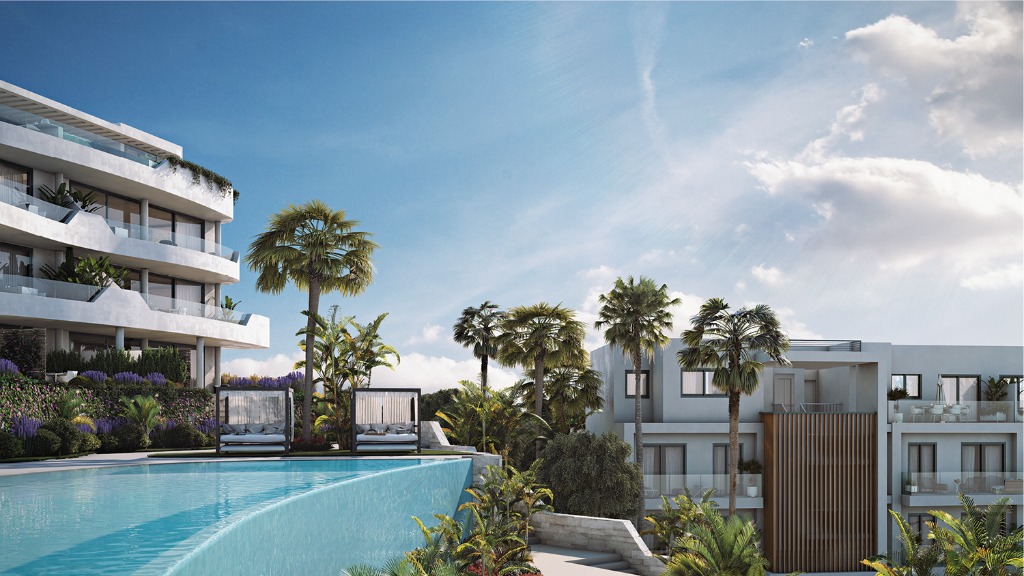 Omgeven door groene zones en met een prachtig uitzicht, bevinden de appartementen zich aan de zuidkant van de gemeenschap, op slechts een paar honderd meter van onze privéstrandclub, met de winkels en restaurants in de omgeving binnen handbereik.