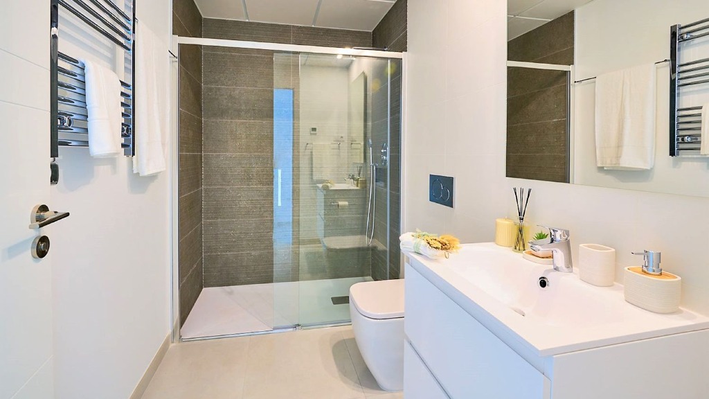 De hoofdslaapkamer heeft een en-suite badkamer. Alle badkamers in de woning zijn voorzien van vloerverwarming.