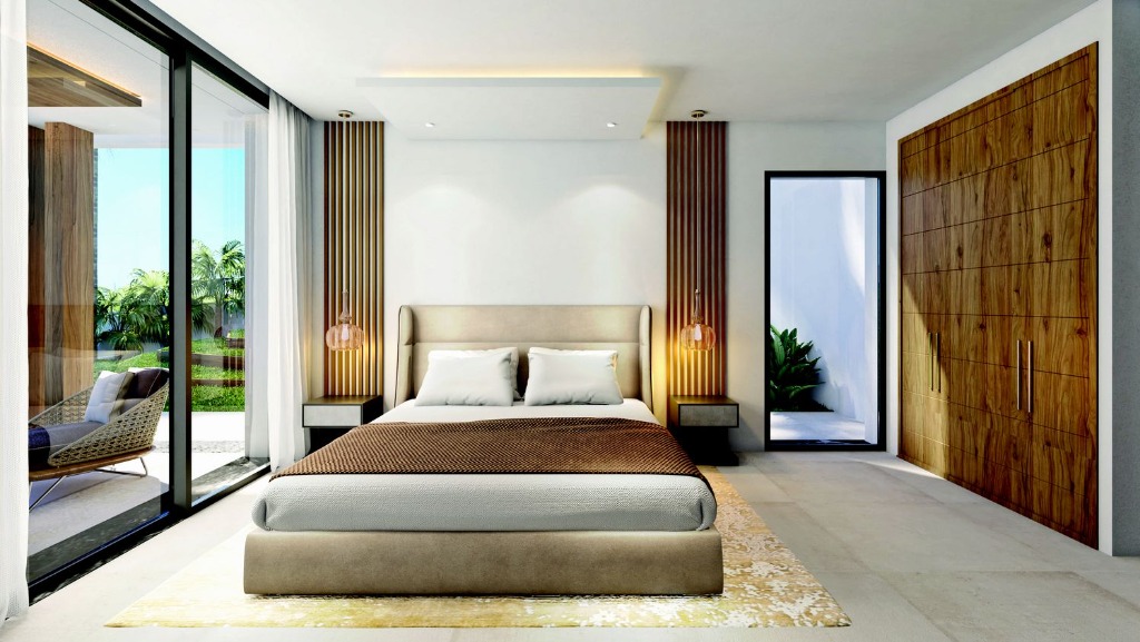 The development has been designed to maximise indoor-outdoor living. Natural light floods through every corner of the property and each living space has been carefully crafted to seamlessly flow from the stylish interior to the immense exterior terraces. Set on 2 floors, these spacious villas have double height ceilings in the living room, enhancing the sensation of space and light. The clever use of glass ensures that views across the garden and out towards the horizon are always free from obstruction.